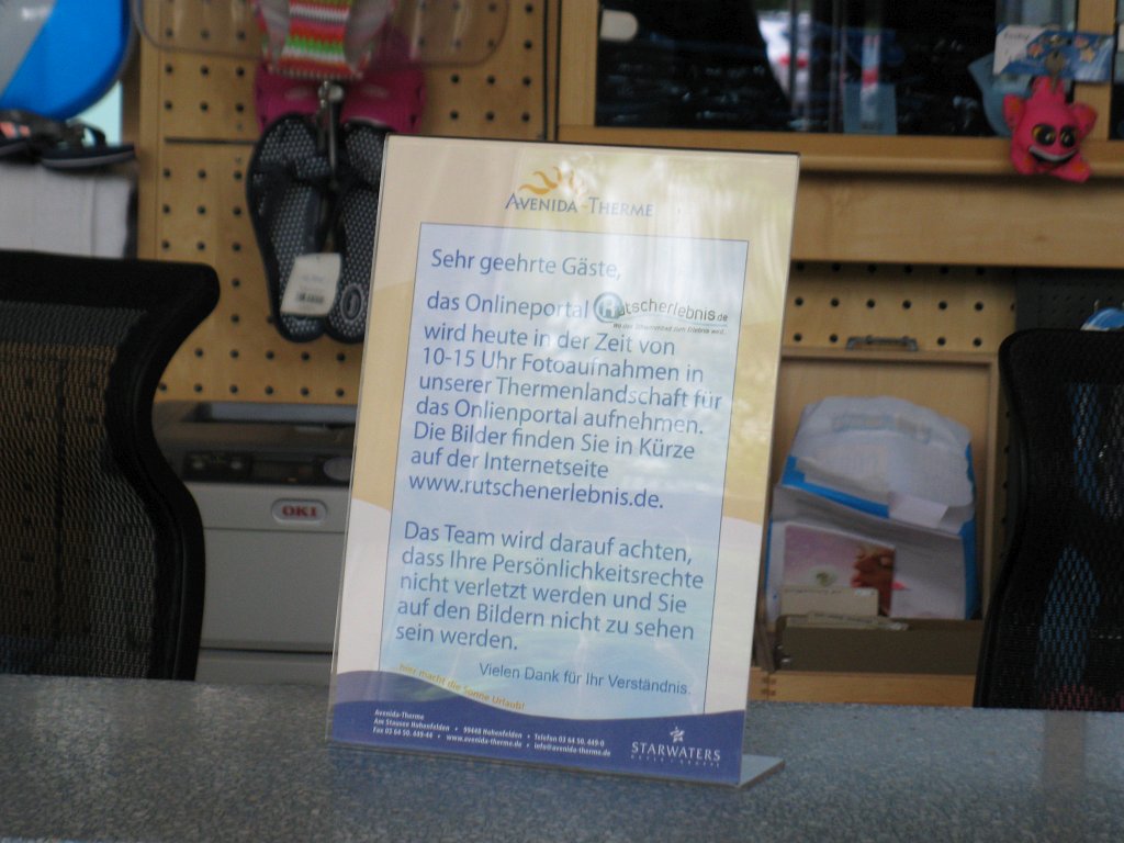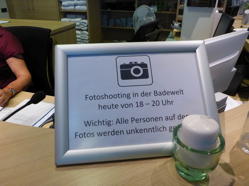 Oft werden gar keine Hinweisschilder aufgestellt, was definitiv ein Nachteil ist - wenn man mit der Kamera durchs Bad läuft, wissen die Badegäste nicht Bescheid, dass heute offiziell ein Fotoshooting stattfindet, und man wird mitunter etwas schief angeguckt bzw. muss sich rechtfertigen. Also auch ein Schild ohne Namensnennung ist durchaus hilfreich und keine Selbstverständlichkeit.