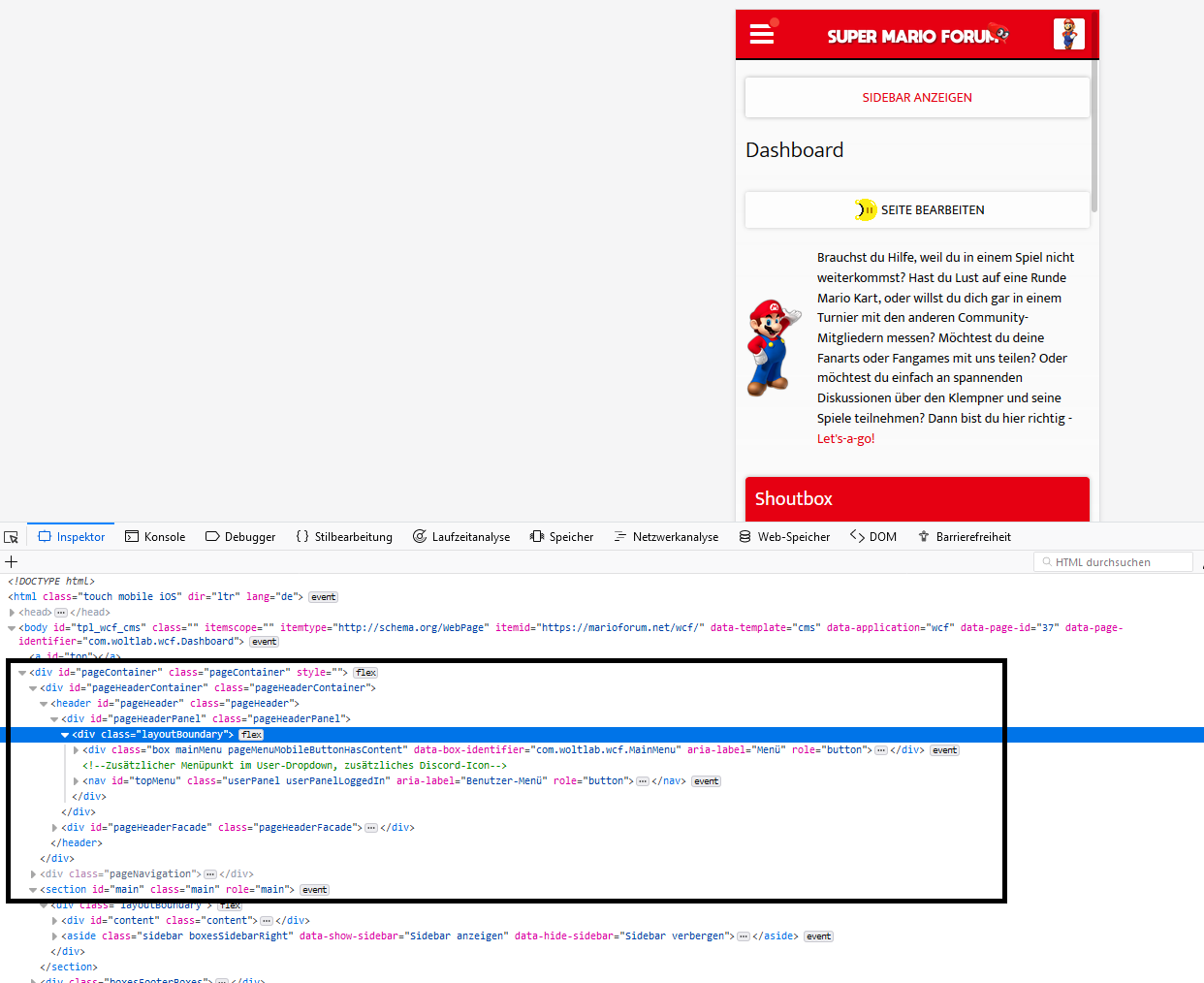 Das javaScript, das für das Ein-und-Ausklappen des Benutzermenüs verantwortlich ist, sucht vermutlich nach #pageHeader .userPanel, kann das aber nicht finden (das nav-Element .userMenü ist hier im eingeklappten, blau markierten layoutBoundary-div), weshalb das Menü nicht aufgeklappt werden kann. Ein JavaScript-Fehler findet sich auch in der Konsole.