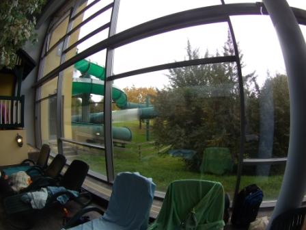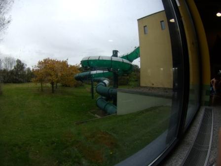 Dann gibt es noch den Durchgang zum Außenbecken. Dieses ist im Sommer recht groß da es recht verwinkelt ist. Alle Bereiche sind miteinander verbunden. Nun aber im Herbst war von diesem nur der quadratische Bereich bis hin zur Brücke zu benutzen, der Rest wurde durch eine Schleuse abgesperrt. Auch hier draußen gibt es nur 3 sehr schwache Massagedüsen und eine Nackendusche. Wäre immerhin etwas, hätte das Wasser nicht Sauna - Tauchbecken - Temperatur. Ich begrüße ja eigentlich auch mal etwas frischere Becken und ich habe es auch gut 5 Minuten in diesem ausgehalten, aber das war dann doch zu frisch ( zumindest auf Dauer ). So ist das Becken im Herbst/Winter keine alternative für Badegäste. Schnell wieder rein, brrrrrrrrr.