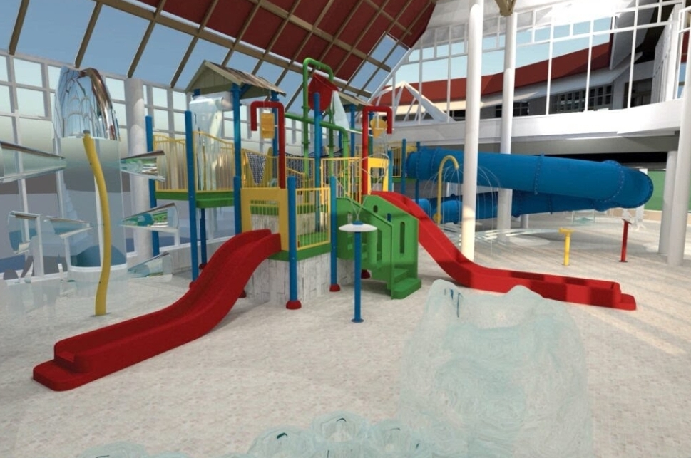 --> das Besondere: das Bad besitzt bereits eine halboffene 75m lange GfK-Rutsche, welche erhalten bleiben soll.