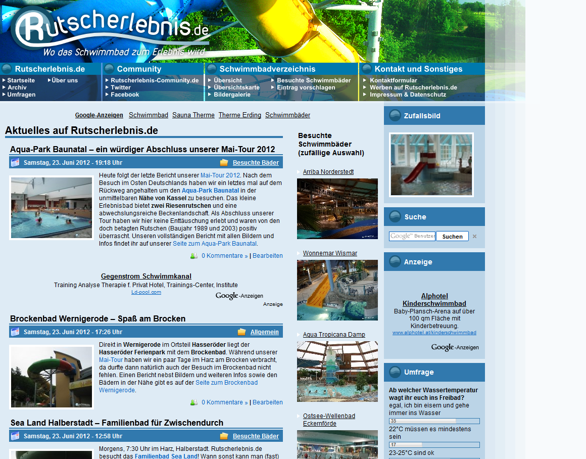 Um das ganze zu erweitern, plane ich außerdem ein Verzeichnis mit Informationen (Rutschentypen, Beckentypen, Attraktionen, Hersteller, Bädergruppen, Wellness-Lexikon), da hab ich einige Ideen. Und weiter ausbauen möchte ich auch den Newsbereich (aktuell auf der Startseite, bleibt auch dort), möchte dort aber Themenreihen etablieren (wie zuletzt mit Erlebnisbäder bauen um, siehe http://www.rutscherlebnis.de/2…uamagis-plettenberg-2012/).