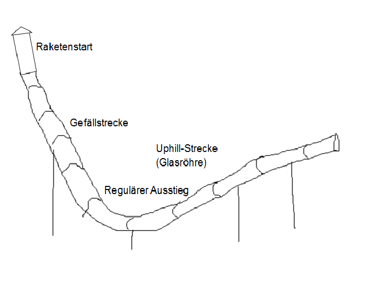 Man wird durch einen Raketenstart in die Tiefe geschossen. Und jetzt kommt die Besonderheit: Nach der steilen Gefällstrecke aus 17 m höhe folgt eine Uphillstrecke nach oben (natürlich nicht senkrecht, ein bisschen steiler als ein schräggestellter, also normaler, Looping). Diese Strecke ist komplett grade und besteht vollständig aus Glaselementen. Nach dieser Strecke endet die Rutsche einfach. Denn man wird langsamer und langsamer, und rutscht dann rückwärts zurück. An den Glaselementen sind Längen angegeben, sodass man immer sehen kann, wie weit man gekommen ist. Da man zum Schluss so langsam ist, dürfte es auch kein Problem sein, diese zu erkennen. Also: Man rutscht zurück, nachdem man schön 0 g erreicht hat, pendelt ein bisschen hin und her und steigt dann durch das Loch aus, das man bei Loopingrutschen "Notklappe" nennt. Das ganze wäre eine absolute Neuheit, aber auch ein Kapazitätskiller. Daher würde ich zwei davon nebeneinander bauen, damit noch angemessen viele Leute rutschen können. Wie findet ihr dieses Konzept, abgesehen von der grauenhaften Zeichnung im Anhang? ;)