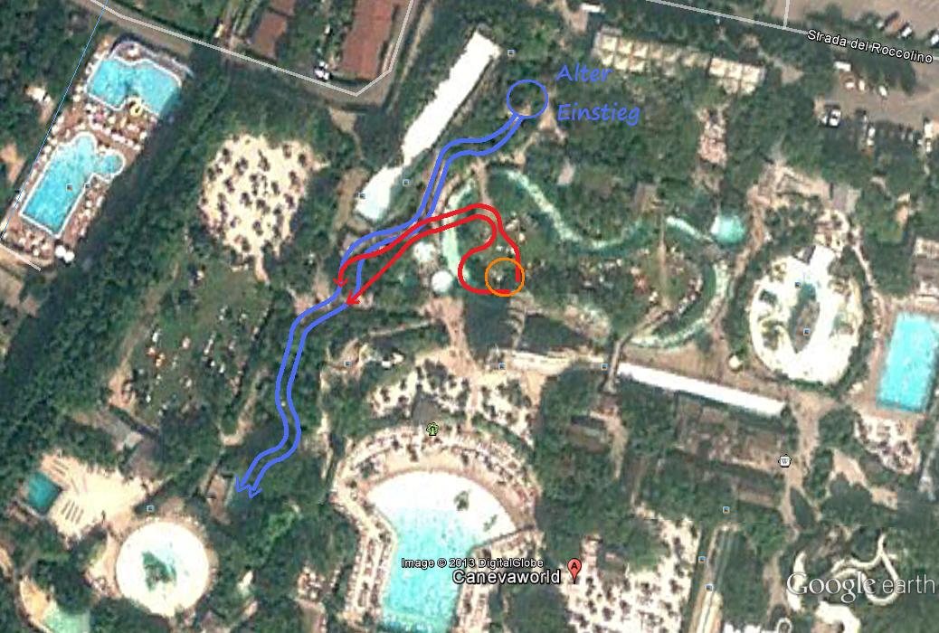 Etwas suboptimal ist bei dieser Rutsche, dass man zuerst für einen Reifen anstehen muss, an vollen Tagen bis zu einer dreiviertel Stunde. Hat mal aber erstmal einen Reifen, läuft man den langen Berg (ja, der Wasserpark hat Hanglage) hoch und gelangt zum Startbecken. Über diesem thront ein künstlicher Felsen mit einen Schiff oben drauf, von dem ein großer Wasserschwall auf den Crazy River hinunterfällt. Von hier aus geht es ganze zehn (!) Zwischenbecken, unterbrochen von kurzen Rutschenabschnitten mit teilweise starken Gefällen. Die Fahrt dauert insgesamt sehr lang und lässt sich wegen den vielen Zwischenstopps beliebig ausdehnen oder verkürzen. Die Strömung ist teilweise so verrückt, dass man eine Weile lang in einem Becken „steckenbleibt“, und Kollisionen mit anderen Rutschern sind auch an der Tagesordnung. Nach dem letzten Zwischenbecken geht es in einer langgezogenen und steil abfallenden Kurve zurück ins Landebecken, wo man den Reifen den Wartenden abgeben muss. Fazit: ziemlich crazy, für Fans von schnellen Rutschen aber eher nix.