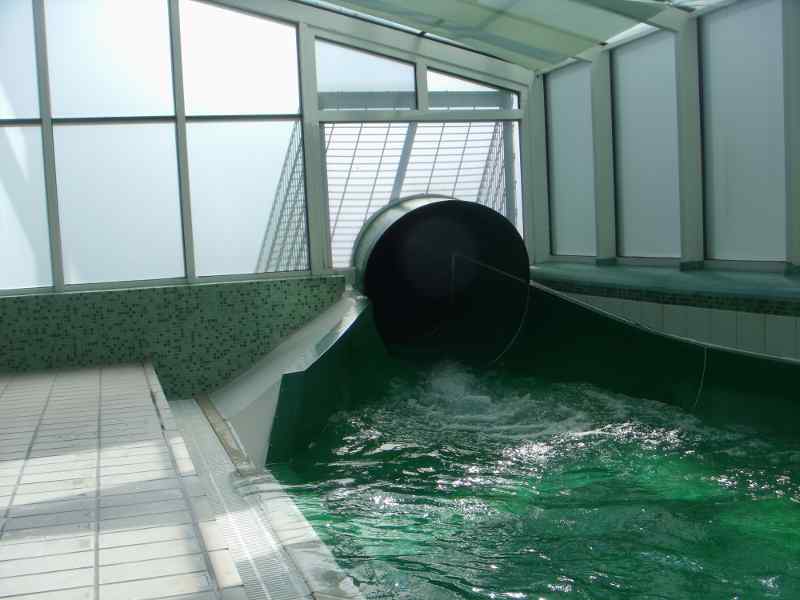Des Weiteren verfügt das Schwimmbad über ein Wasserrutsche, die bereits prominent direkt beim Betreten der Schwimmhalle durch die große Glasfront auffällt. Die von außen dunkelgrüne, ovalförmige 79 Meter lange Röhrenrutsche ist von Cienia. Bisher war ich nur eine einzige Rutsche dieses Namens gerutscht. An der, als offene Halbschale ausgeführten, familientauglichen Röhrenrutsche in der Grömitzer Welle gab es für mich keine Kritikansätze. Umso mehr war ich von der Rutsche im Bäderland Bramfeld überrascht.